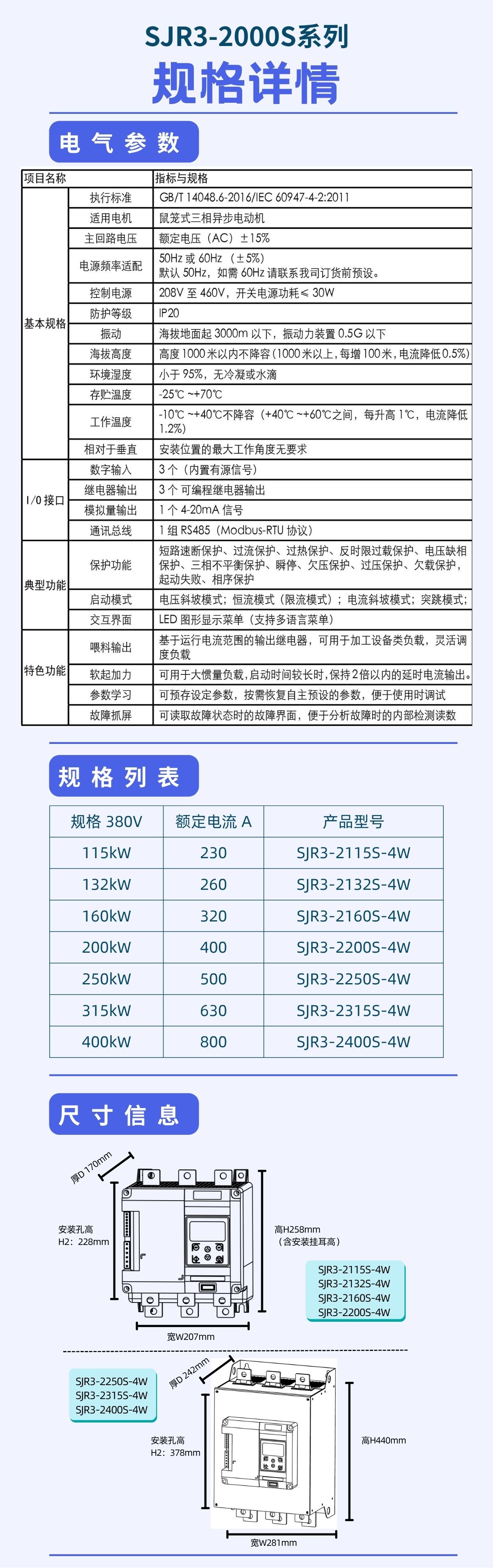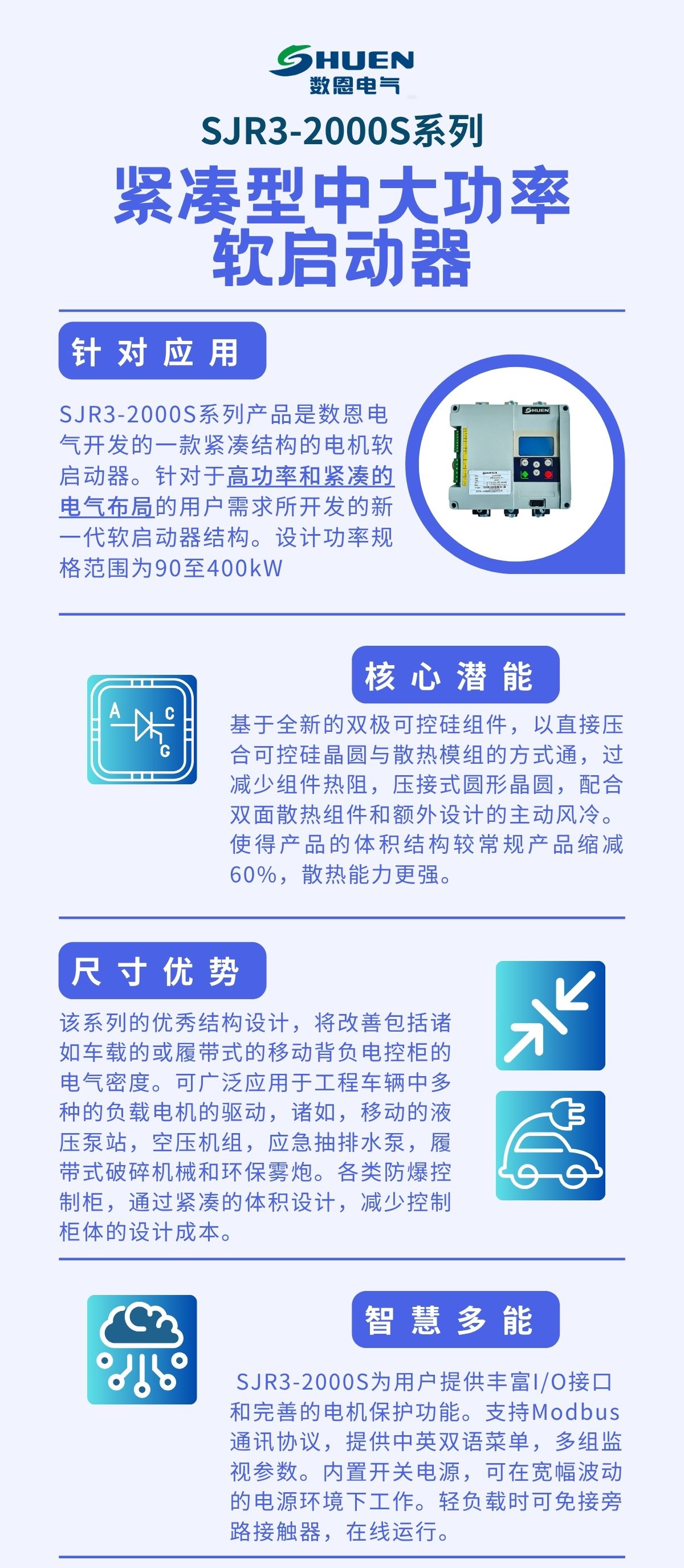 SJR3-2000S是CA88官网公司最新研发的超紧凑软启动器,针对紧凑的车载(履带式)电柜 / 防爆电箱 / 壁挂基业箱 提出高密度电气解决方案,兼容在线式应用的同时兼备有外置旁路连接方式,增加了欠载,运行次数,运行时间,线性的温度监控等多种功能,内置集成了RS485通讯总线,提供多语种菜单。